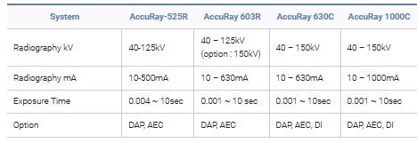 AccuRay 525R/603R/ 630C/1000C is general diagnosis X-ray system, it appropriate image is provided accordance with diagnostic object, also this system can be combined with various configuration by user’s purpose.