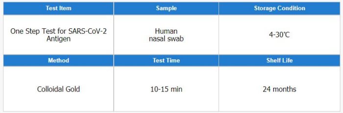 Test Item: SARS-CoV-2 Antigen. Sample Type: Human nasal swab. Test Time: 10-15 min. Methodology: Colloidal Gold.