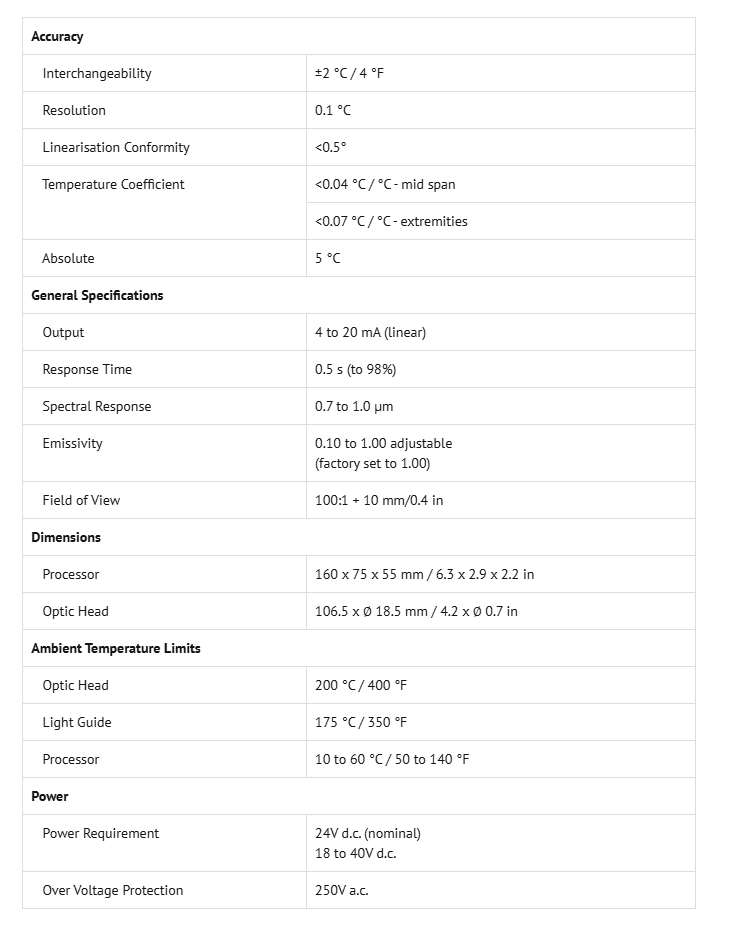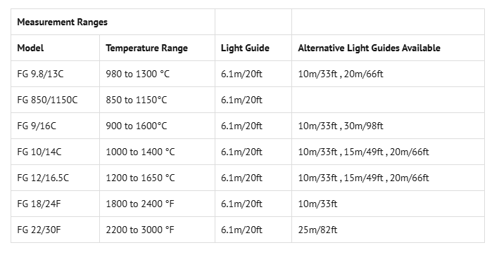FG offers long-term, drift-free operation with no on-line calibration requirement. The signal processor unit is located away from the high temperatures at the optic head, linked by a multi core fibreoptic light guide.