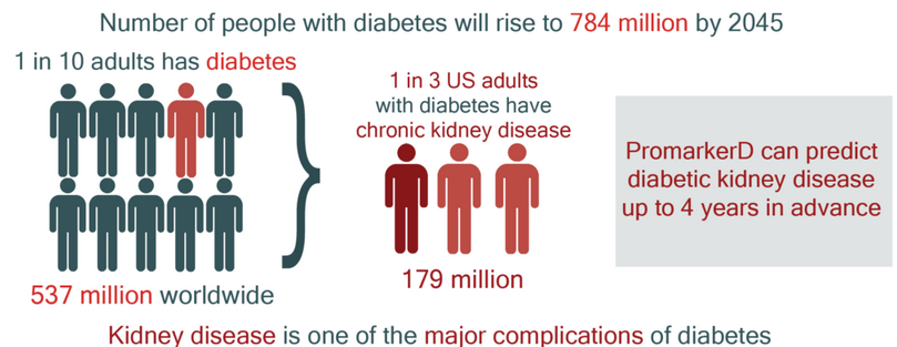 The Promarker™ platform identified a panel of novel protein markers (biomarkers) that are significantly effective in diagnosing and predicting diabetic kidney disease. There biomarkers include ApoA4, CD5L and IGFBP3. The ability of the biomarkers to diagnose and predict diabetic kidney disease has been studied and verified. In validated clinical studies, the PromarkerD test system predicted 86% of otherwise healthy diabetics who went on to develop DKD within four years.