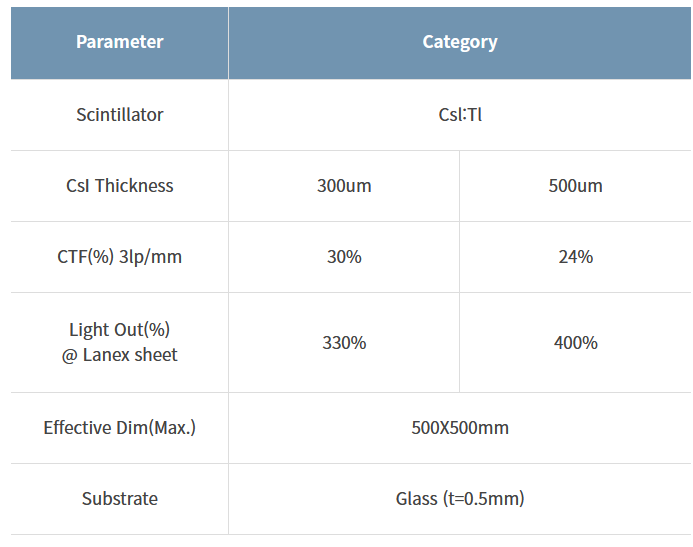 Size: Customization to the needs of customers available. CsI Thickness: Customized spec. available in addition to 300um/500um. Performance: High-performance Light Out and CTF.