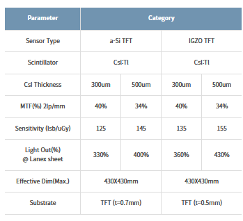 Sensor: a-Si / IGZO TFT. CsI Thickness: 300um/500um외 Customize.