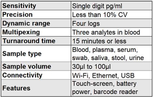 Proxim has developed a next-generation handheld immunodiagnostic device. The system performs the most important laboratory tests near the patient using whole blood without any sacrifice in sensitivity and precision, bringing the most critical information to the doctors right when they need it. The instrument is battery operated, has touch-screen display interface, wireless, Ethernet, and USB connectivity.