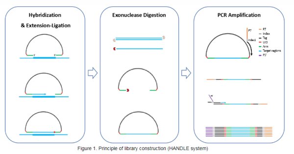 The test kit is based on Halo-shape ANnealing and Defer-Ligation Enrichment system (HANDLE system) technology which is improved Molecular Inversion Probe (MIP) technology to capture the target gene region (Figure 1). During the library construction process, each individual DNA molecule is tagged with a unique molecular index (UMI) at both ends, which allows high sensitivity in variant detection by eliminating any library amplification and sequencing bias. The test kit uses DNA extracted from tissue or blood samples, and it offers a time saving protocol that can be completed within 5 hours, and requires just about 1 hour of hands-on time.
