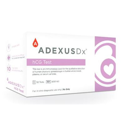 The ADEXUSDx hCG Test is an immunoassay used for the qualitative detection of human chorionic gonadotropin in human whole blood, plasma, or serum and is indicated as an aid for health care professionals in the diagnosis of early pregnancy. Pregnancy tests are based on the detection of human chorionic gonadotropin (hCG), a hormone produced by the placenta around the fourth day after conception. hCG levels rise rapidly and double approximately every two days. The ADEXUSDx® hCG Test can detect hCG in a single drop of whole blood, serum, or plasma without additional reagents or materials. The ADEXUSDx® hCG Test is a rapid chromatographic immunoassay that delivers results in ten minutes.