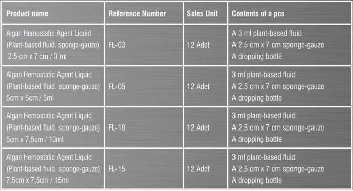 Algan Hemostatic Agent Liquid is a 100 % plant-based bioabsorbable medical device, which is designed to control bleeding resulting from surgical procedures and wounds. The Algan Hemostatic Agent Liquid is impregnated with sponges prior to its use and the impregnated sponge is compressed on the bleeding area. In addition to compression on the bleeding area, the Algan Hemostatic AgentLiquid can be applied to bleeding areas at the same time for additional hemostatic effects. Due to such an easy application, the physician/nurse can prefer either method of use.