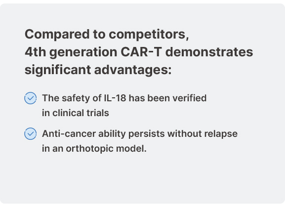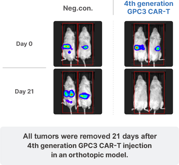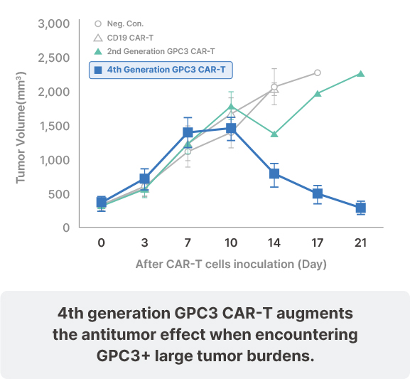 4th generation GPC3 CAR-T shows better efficacy compared to 2nd generation GPC3 CAR-T; Shows better efficacy for tumor clearance than 2nd generation GPC3 CAR-T in vivo; Clear anti-cancer efficacy in an orthotopic model; Smaller number of 4th generation GPC3 CAR-T required than other groups to remove HCC.