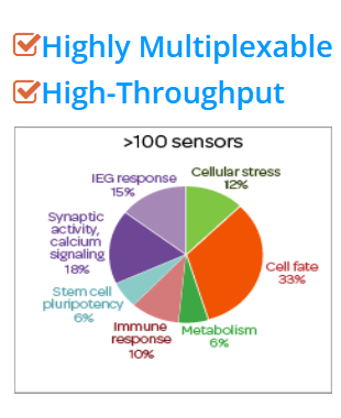 In more detail, 100 barcoded sensors facilitate the analysis of distinct transcription factor activities as distal endpoints of signaling cascades. Defined treatment conditions, such as various concentrations of a compound, time points, etc., are measured within one experiment using the proprietary EXTassay technology.