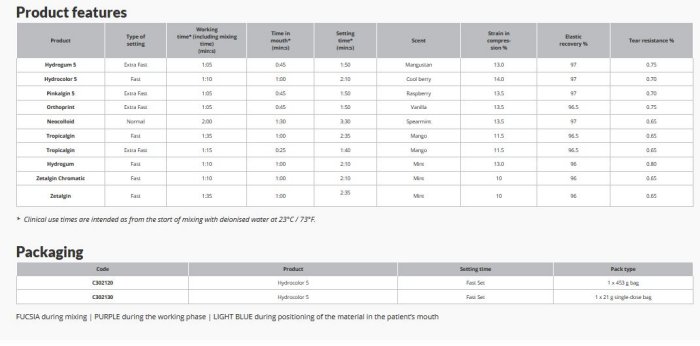 - The chromatic variation provides practitioners with a visual guide during the various processing phases: fucsia during mixing, purple during the working phase and light blue during positioning in the patient’s mouth