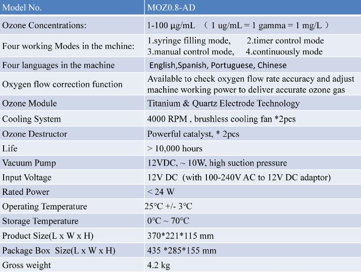 The model MOZ0.8-AD is a new medical grade ozone generator that designed for multi-treatments with four working modes. These workings modes are super convenient for users to do different therapy applications. It uses the 99.9% pure Quartz and Titanium electrodes to make pure oxygen/ozone mixed gas. The advanced computer chips and sensors are used to monitor oxygen flow and guarantee accurate ozone concentration outputs. It can deliver pure ozone from low to high concentrations (1 ~ 100 µg/mL) , and it has been built-in both the powerful ozone destructors and the strong vacuum pump inside.