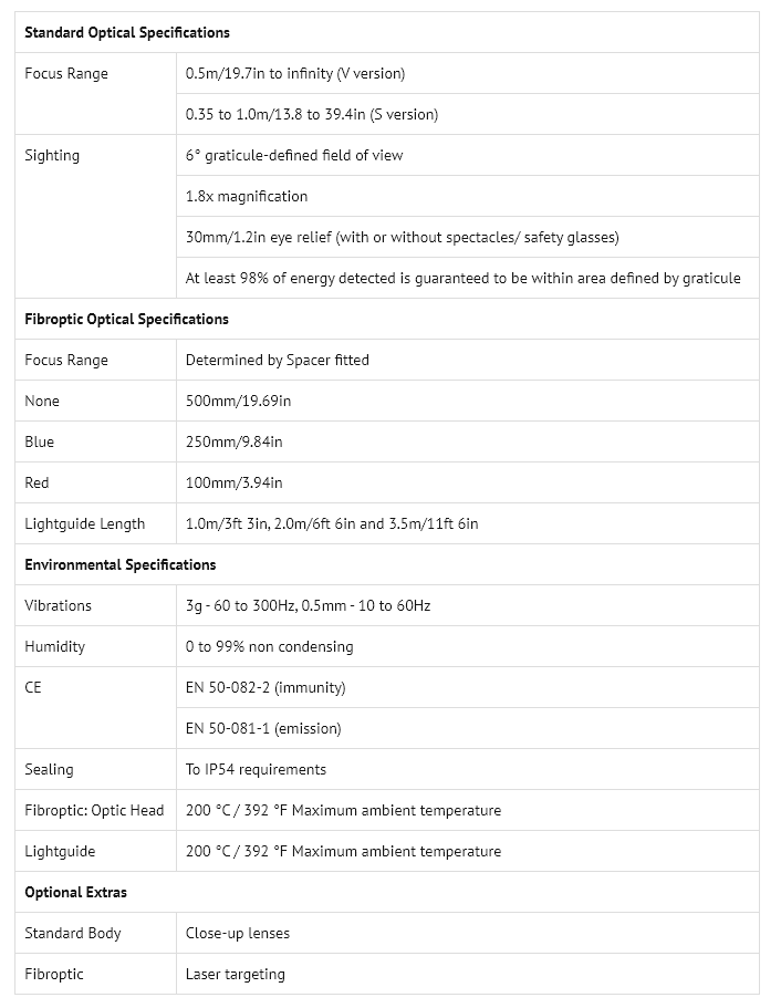 With its combination of focusable optics that don`t require the thermometer to be removed from its protective mounting jacket and through the lens sighting for clear, guaranteed target confirmation is assured. Optional close up lenses enable System 4 to provide accurate, drift-free measurements for targets as small as 0.45mm (0.02in).