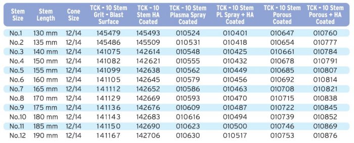 TCK-10 Hip Prosthesis is intended for uncemented use in the primary application as treatment of the followings; patient conditions of noninflamatory degenerative joint disease, avascular necrosis, osteoarthritis and inflammatorily joint disease, rheumatoid arthritis. TCK-10 Hip Prosthesis is designed to be durable for revision hip arthroplasty when there is an intact metaphyseal-diaphyseal junction for adequate press-fit stability at surgery. The interlock grit- blast all over on the stem surface provides increased fixation at the prosthesis/cement interface compared with that of traditional smooth surface implants. Optional Ti. plasma spray (PL), HA coated or porous coated stems uses the osteo-conductive qualities of this efficient biomaterial or porous which produce the mineral fraction of natural bone.