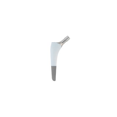 The BethaLoc® hip stem is made of implatan® titanium alloy (TiAl6V4) and is available in a standard and lateralised offset version, each with a CCD angle of 130°. Rotational stability and osseointegration are improved by the longitudinal grooves on the entire stem. The proximal two-thirds of the stem are coated with hydroxyapatite (HA) to support the osseointegration.