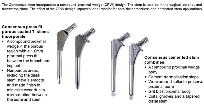 The Consensus Hip System was developed from well established and clinically proven design principles. The Consensus Hip System restores the original anatomic position of the femoral shaft to the acetabulum. The stem is designed to facilitate restoration of a wide variety of femoral geometries. The position and angle of the femoral stem taper with respect to the femoral shaft and lesser trochanter is set at the neutral average of all femoral geometry. The Consensus stem incorporates a compound proximal wedge (CPW) design. The stem is tapered in the sagittal, coronal, and transverse plane. The effect of the CPW design improves load transfer both the cementless and cemented stem applications.