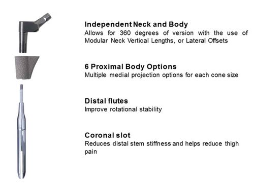 The Consensus Orthopedics UniSyn™ Hip System has been designed with total flexibility in mind. All components are completely interchangeable. This allows for independent adjustment of both the size and orientation of the heads, bodies and stems. All three components can be individually fitted to specifically match the patients’ anatomic structure. The UniSyn Hip System features patented connection technology that allows the surgeon to independently fit the diaphysis and metaphysis, and then select the neck component that will best restore leg length, offset and anteversion of the patient’s hip joint. 59 Head Centers ¦ Infinite Version Control ¦ Titanium Plasma Surface