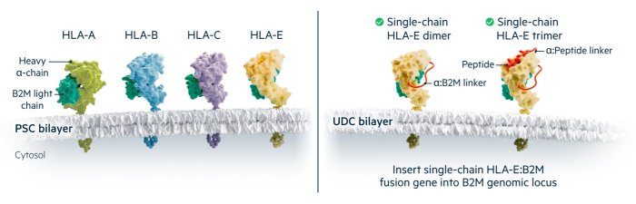Class I molecules present peptides to CD8+ T cells and are composed of B2M paired with diverse heavy alpha chains. Human cells express two alleles each of three polymorphic HLA class I molecules (A,B and C) that must be matched to recipients, as well as the non-polymorphic HLA-E molecule. Universal Donor Cells do not express free B2M and lack surface expression of HLA-A, B and C. The B2M-HLA-E single chain fusion protein is expressed from the B2M locus to inhibit lysis by host NK cells, with or without a covalently attached antigenic peptide in the trimer and dimer forms respectively.