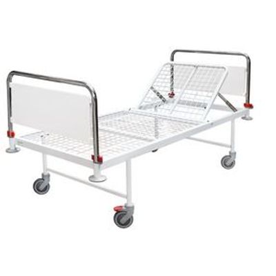 Raising backrest adjustable by means of a cranck,with all welded enamelled main frame made of rectangular section steel tube. Removable chrome plated bed ends fitted with 10 mm. Laminated plastic panels. Platform fitted with epoxy-painted steel weldmesh in two sections. The bed is mounted on four 125 mm. Castors, two w/brakes. Bumpers at all four corners. Knock down construction. Adjustable backrest by means of a rack device.