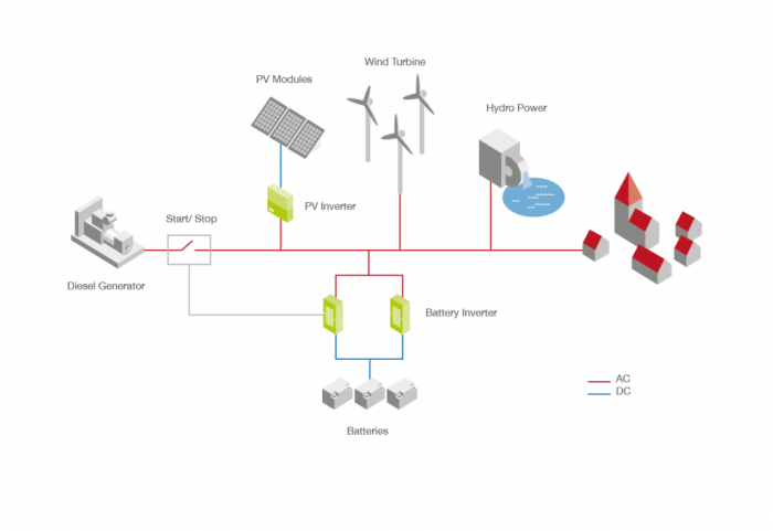 Regions with unstable supply by public electricity networks often use diesel generators as emergency generators. The operation of these diesel generators is much more economical through the integration of renewable energy systems using hybrid systems. Depending on the location of various energy sources such as solar, wind and water can be combined into hybrid systems.