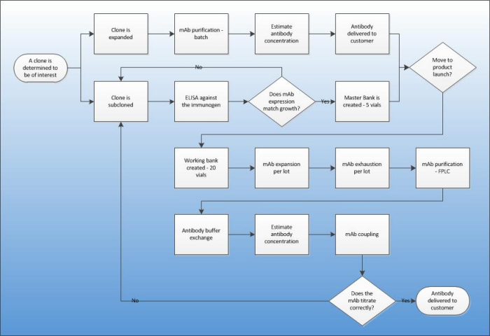 At this point, you have identified a mouse monoclonal antibody that will be of use to your research and/or product development and you need more of it produced - what are the next steps? While it will depend on your specific needs, in general we will recommend doing two additional subclonings (one subclone becomes a master bank of hybridoma cells and a second subcloning becomes a working bank of hybridoma cells) before producing additional antibody. Please see the process map below for the necessary steps and required time for production. Do you need some antibody in a hurry? Take advantage of our NeoAb STAT production and receive additional purified antibody in as little as 4 weeks!