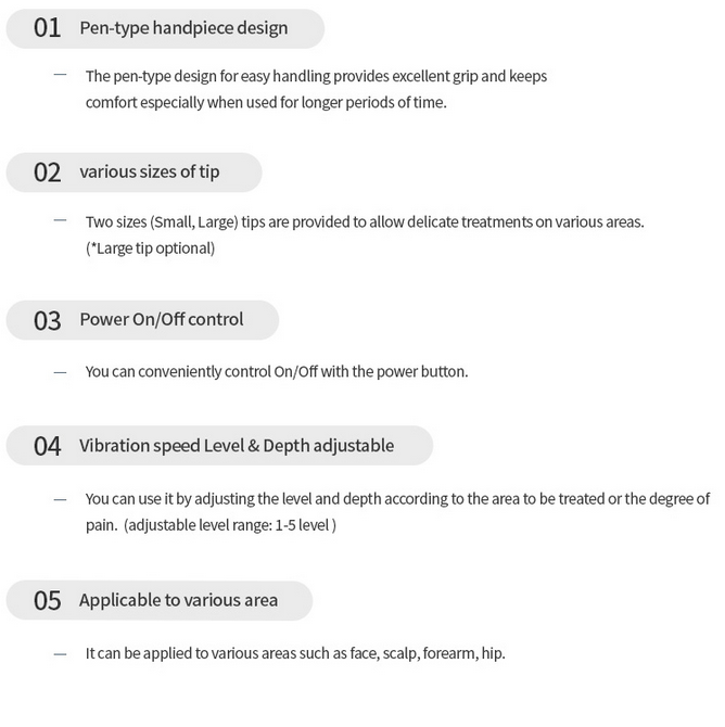 The principle of the hyper-jet S treatment is extremely simple yet effective. The vibration of micro-tips at a high speed will give physical stimulation to the facial skin and expedite the absorption of nutrition molecules. Depending on treatment site, from the wide area such as body, scalp to the local delicate perioral, periorbital area, user can choose the size of the tip(Large, Small). The handpiece is designed to be portable pen-type, making it easier to carry around and self home care.
