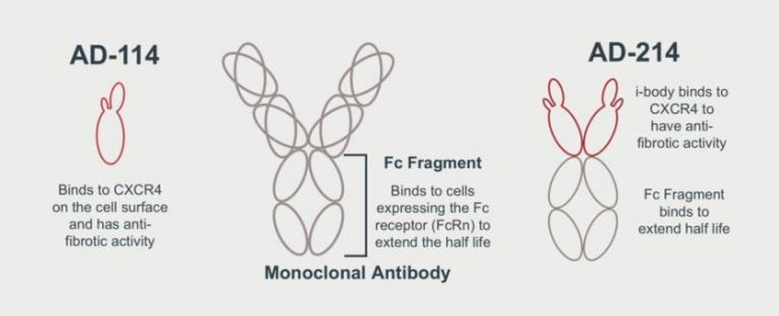 AD-214 is an Fc-Fusion protein that contains two AD-114 i-body molecules at the front end, that bind with high affinity to the human target, CXCR4. At the back end of AD-214 is the Fc Fragment or tail region of a traditional monoclonal antibody that will extend the half-life or duration of time in which the i-body will stay in the body.