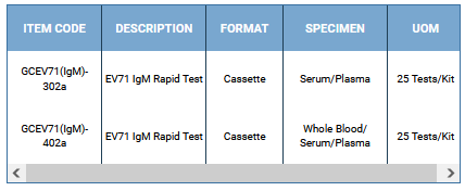 The EV71 IgM Rapid Test Cassette is a sandwich lateral flow chromatographic immunoassay for the qualitative detection of IgM-class antibodies to human Enterovirus 71 (EV71) in human whole blood, serum or plasma. It is intended to be used as a screening test and as an aid in the diagnosis of infection with EV71.