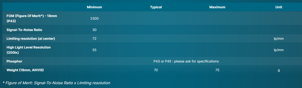 The 4G+ image intensifier tubes meet the stringent requirements of modern warfare at night to deliver end-users a very high performance in all field conditions. The 4G+ technology offers extended bandwidth for high image quality on all theatres of operation, a very fast auto-gating and a small halo providing more details around light sources. Thanks to a very high Figure Of Merit (FOM) and extended sensitivity, operators benefit from the best possible range in all types of environment.