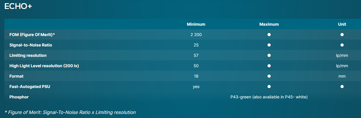 ECHO image intensifiers are a high-performance, low-cost offering to the commercial market. This technology can offer ultra-fast Auto-Gating, a small halo and the high resolution expected from a high-grade tube.