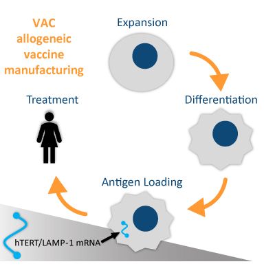 VAC2 is an allogeneic, or non-patient specific, cancer vaccine candidate designed to stimulate patient immune responses to telomerase which is commonly expressed in cancerous cells but not in normal adult cells. VAC2, which is produced from our pluripotent cell technology using a directed differentiation method, is comprised of a population of mature dendritic cells. As the most potent type of antigen presenting cell in the body, dendritic cells instruct our body’s immune system to attack and eliminate harmful pathogens and unwanted cells. To target cancerous cells, VAC2 is engineered to express the tumor-selective antigen telomerase, which is found in over 85% of all cancers. Because the tumor antigen is loaded exogenously into the dendritic cells prior to administration, VAC2 is a platform technology that can be modified to carry any antigen, including patient-specific tumor neo-antigens.