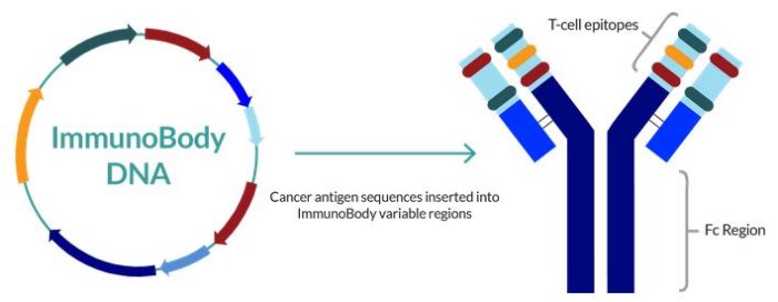 ImmunoBody vaccines are designed to generate potent T cell responses capable of a broad anti-tumour effect. They are DNA vaccines that encode a protein in the form of an antibody, but the parts of the antibody that would normally bind to the target protein are replaced with epitopes from a cancer antigen.