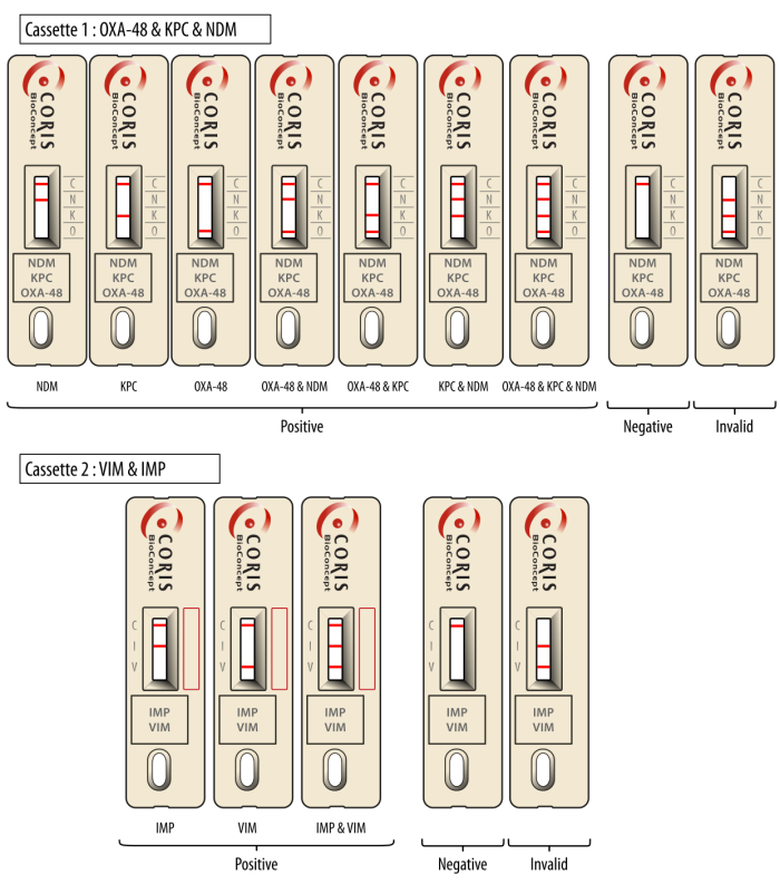 This new immunochromatography test, made of two cassettes, allows the identification of OXA-48-like, KPC, NDM, VIM and IMP carbapenemases in bacterial culture.