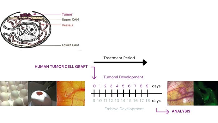 INOVOTION`s technology consists in a CAM assay grafting human cancer cells in the chicken egg environment. This is particularly suitable for tumor development due to the abundance of growth factors in the highly vascularized CAM. The chicken egg model allows rapid studies and requires a minute quantity of compounds. In the embryonic environment, the tumor grows rapidly.