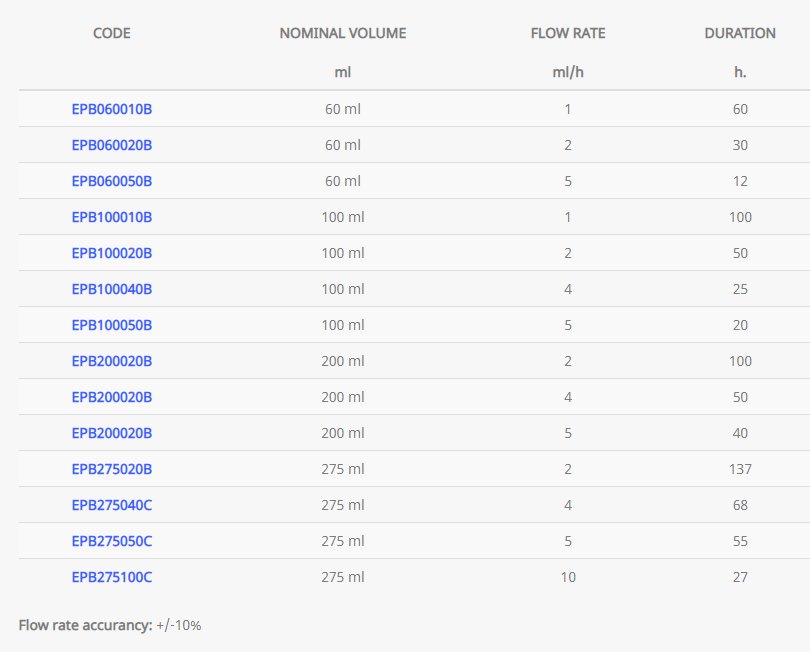 Onefuser B is indicated for intravenous, subcutaneous and epidural administration for antibiotics and analgesic agent for countinuous and controlled delivery infusion rates. Onefuser B is available in different capacities and flow rate in countinous and bolus type. Onefuser b is easy to set up and use and no specific filling equipment is required.