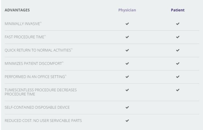 More than 130,000 ClariVein units are in market. The ClariVein device is designed to benefit patients and physicians alike. The ClariVein OC is a specialty infusion catheter with a rotating wire tip designed for the controlled 360-degree dispersion of physician-specified agents to the targeted treatment area. Often referred to as MOCA (mechanical occlusion chemically assisted), the ClariVein OC Device offers many unique and proven benefits: Non-tumescentNon-thermalClinically ProvenReduced Pain1Reduced Recovery Time1Reduced Procedure Time.