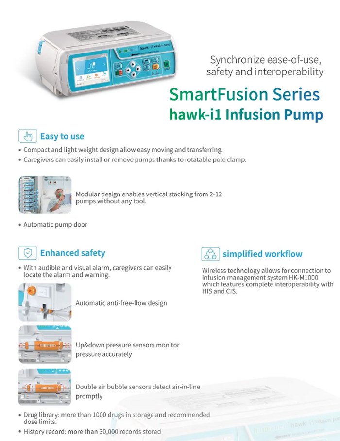 Compact and light weight design allow easy moving and transferring. Caregivers can easily install or remove pumps thanks to rotatable pole clamp. Modular design enables vertical stacking from 2-12 pumps without any tool. With audible and visual alarm, caregivers can easily locate the alarm and warning. Automatic anti-free-flow design and up&down pressure sensors Double air bubble sensors detect air-in-line promptly. Drug library: more than 1000 drugs in storage and recommended dose limits. History record: more than 30,000 records stored. Wireless technology allows for connection to infusion monitoring system HK-M1000 which features complete interoperability with HIS and CIS.s
