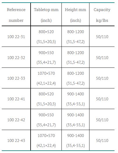 10022 has the same features as the 10020 table, plus it can be used both as an instrument table and a mayo table. The height of the table can easily be adjusted by pressing buttons situated under the tabletop. The table can be operated when the sterile drape is in position, without compromising sterility. Height adjustment can be carried out without moving the table away from the operating table.