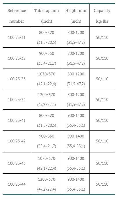 The 10023 table has the same features as the 10020 table except that the pillar is moved to the back of the tabletop. Because of this, it is possible to move the table over the operating table to reach the items when standing on the other side, just like with a mayo table. The special shape of the chassis of the table also makes it possible to stack the tables under each other to save space when not in use. This is an appreciated feature when working in preparation rooms where the space is limited.