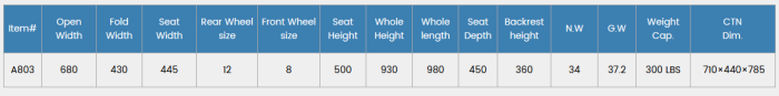 Front Wheel: 8’, PU pneunatic tyre. Rear Wheel: 24 magnesium alloy tyre. Seat & Backrest: Foldable backrest, Nylon+foam.