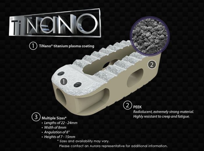 ECHO™ is Aurora Spine`s modern, minimally invasive PLIF interbody fusion system. Manufactured out of PEEK, each cage is precision coated with TiNANO®, Aurora Spine`s titanium plasma spray coating. Aurora Spine cages feature a self-distracting nose, as well as teeth on the inferior and superior surfaces to help prevent retropulsion and migration. Graft windows have been designed to maximize the space for bone materials to help promote integration and fusion. Cages are available in various footprints and heights to accommodate variations in patient anatomy. Interbody cages featuring TiNANO are designed to have a friction fit. The TiNANO coating will add approximately 0.25mm thickness to the overall height of the cage.
