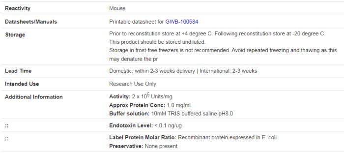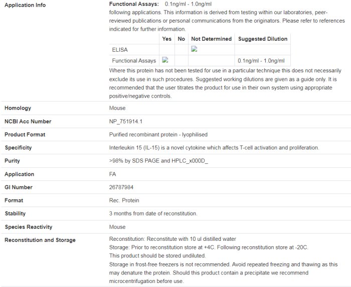 Name: INTERLEUKIN-15 Recombinant Protein (GWB-100584), Related Product Names: RECOMBINANT MOUSE INTERLEUKIN-15 IL-15, Gene Symbol: Il15, Gene Family: IL, Gene id: 16168, Alias Symbols: AI503618, Il15, Swissprot ID: P48346, Protein Name: Interleukin-15, Description of Target: RECOMBINANT MOUSE INTERLEUKIN-15, Protein Accession Num: NP_032383.1