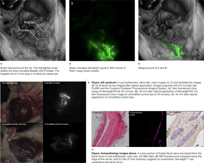 We have shown in vivo Proof-of-Concept of Nervelight™, a nerve imaging agent that is comprised of a commercially available Near InfraRed (NIR) dye in the 800 range attached to recombinant human Nerve Growth Factor (800-rhNGF). When Nervelight™ was applied topically, intra-operatively in an incision model of just-euthanized naïve rats, we showed selective uptake into cavernous nerves (below), facial nerves (below), and sciatic nerve (data not given). When studied recently in live animals, the selectivity and brightness of Nervelight™ is further enhanced. We will update this page when additional data is publicly available.