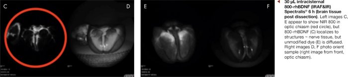 This study showed that when 800-rhBDNF is injected intracisternally in a single dose, midline at the base of the skull where the optic nerve originates, the NIR dye was localized to the optic nerve and transported to the optic nerve heads. Data were presented in a poster in collaboration with Absorption Systems (San Diego, CA) at Military Health System Research Symposium, August 2019. An excerpt from that poster is given below.