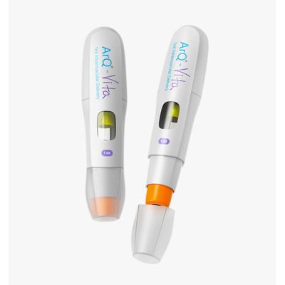 The ArQ® - Vita Plus device is a powerful autoinjector for deep intramuscular delivery, with an extended capability in comparison to the ArQ - Vita platform. It can handle volumes from 1 to 3 ml with viscosities of up to 100 cP and needle sizes from 20 to 25 GRW with an exposed length of between 12.5 mm to 40 mm, depending on the patient population. The device incorporates a proprietary mechanism that facilitates consistent delivery of non-Newtonian formulations or drugs held in suspension, which may pose risk of separation over shelf-life. The device also features a large viewing window with visual delivery indication and both a start and end of dose audible indication. The ArQ® - Vita Plus container is lubricant, rubber and tungsten-free.