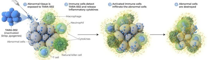 When TARA-002 is administered, it is hypothesized that innate and adaptive immune cells within the cyst or tumor are activated and produce a strong immune cascade. Neutrophils, monocytes and lymphocytes infiltrate the abnormal cells and various cytokines, including interleukins IL-2, IL-6, IL-8, IL-10, IL-12, interferon (IFN)-gamma, tumor necrosis factor (TNF)-alpha, and granulocyte colony-stimulating factor, and granulocyte-macrophage colony-stimulating are secreted by immune cells to induce a strong local inflammatory reaction and destroy the abnormal cells.