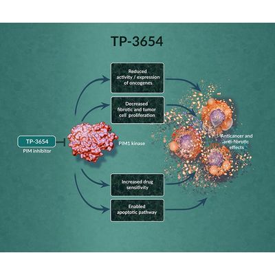 TP-3654 is an oral investigational inhibitor of PIM kinases, which has potential antitumor and anti-fibrotic effects through multiple pathways, including induction of apoptosis.41,42