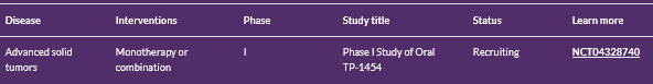 A first-in-human, phase I trial of TP-1454 is currently being conducted in advanced solid tumors.