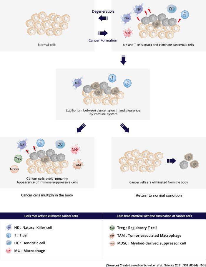 Immunity can be divided into two types: innate immunity and acquired immunity. Innate immunity is an inborn mechanism primarily composed of macrophages and NK cells, which are the first line of defense to eliminate unwelcome pathogens and cancer cells inside the body. Acquired immunity is a mechanism mediated by T cells and B cells, which recognize particular foreign substances in the body, and are activated by those specific substances to eliminate them. Cell-mediated immunity via NK cells and T cells is vital to eliminate cancerous cells.