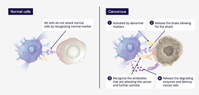 NK cells, a type of lymphocyte, recognize abnormal cells such as cancer and virus infected cells, attack them directly, and eliminate them from the body.