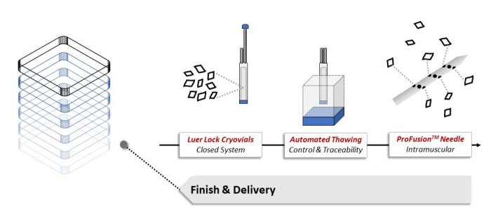 Cryopreservation, cold-chain logistics, thawing, and mechanics for injection of biologic therapeutics — particularly a cell therapeutic, or “living medicine” — each bring their own challenges and risks. We are utilizing the ProFusion™ Therapeutic Infusion Needle & Compass® CT technologies (Cook Regentec) for efficient intramuscular cell delivery.