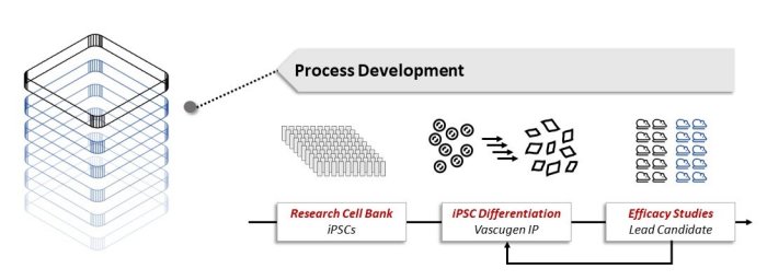 We engineer from iPSC to vasculogenic cells, meaning those cells capable of forming healthy blood vessels on their own when delivered into an oxygen-starved tissue. Proprietary methods are identified that yield the vasculogenic cell, and then the cell is tested in a relevant animal model. Arriving at a lead candidate and follow-on candidates is an iterative process.